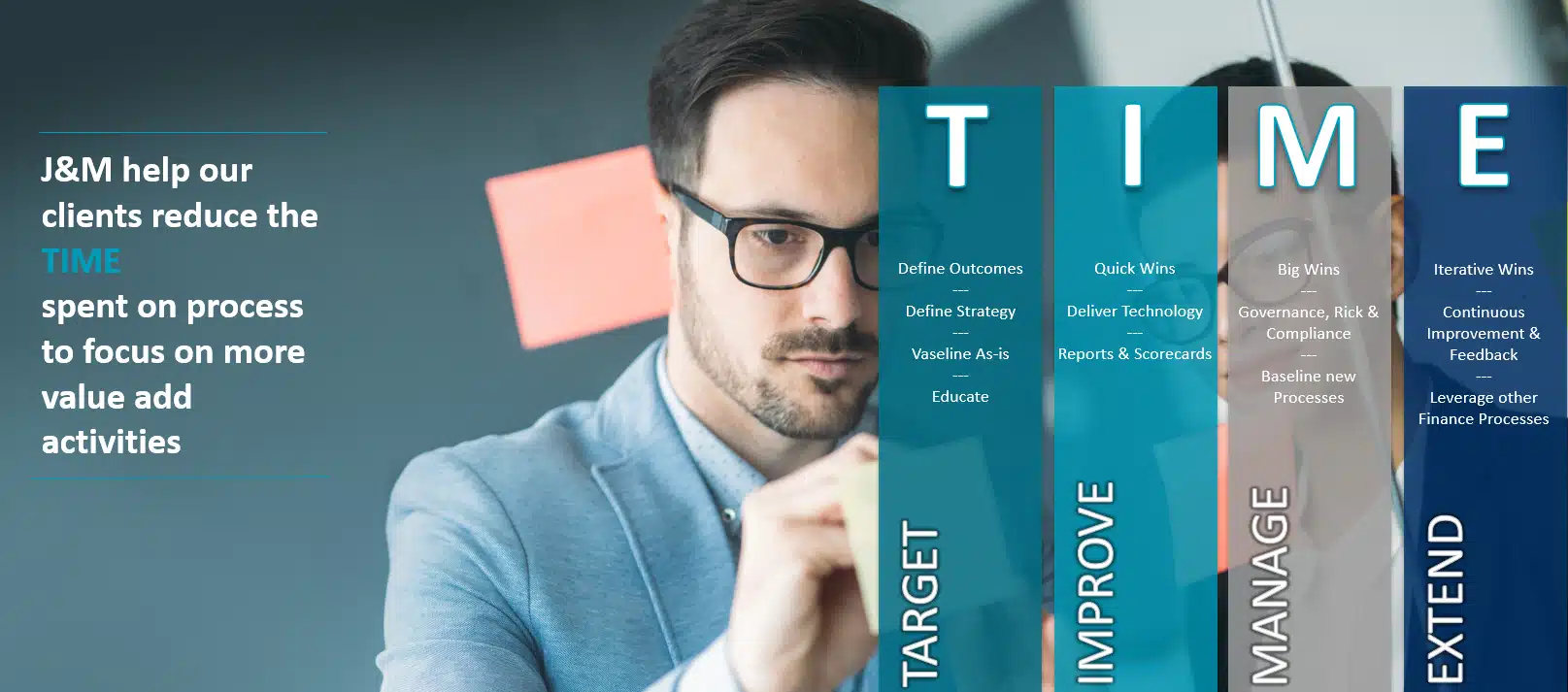 Our delivery model is underpinned by the TIME approach — a structured, repeatable framework that guides how we target outcomes, deliver improvements, manage change, and extend value over time
